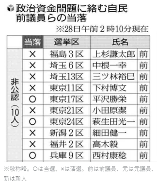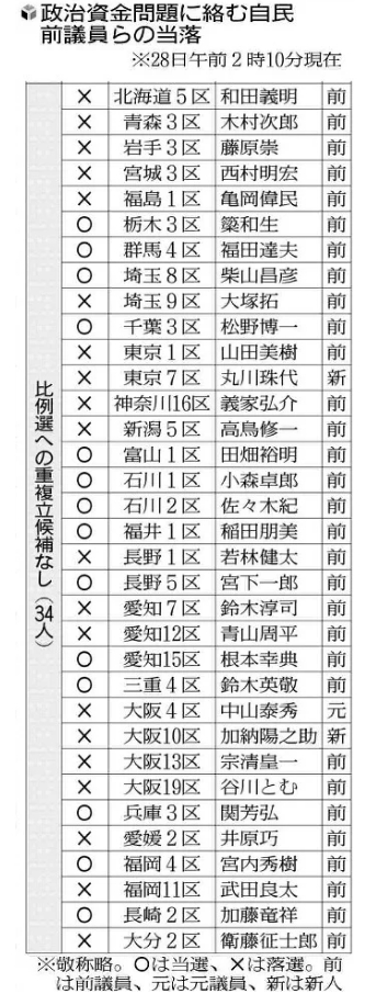 因黑金醜聞未得到自民黨公認的候選人當選情況(圖注:○表示當選,×表示未當選。“前”指“前國會議員”,“舊”指“指前國會議員”,“新”指新人。)讀賣新聞