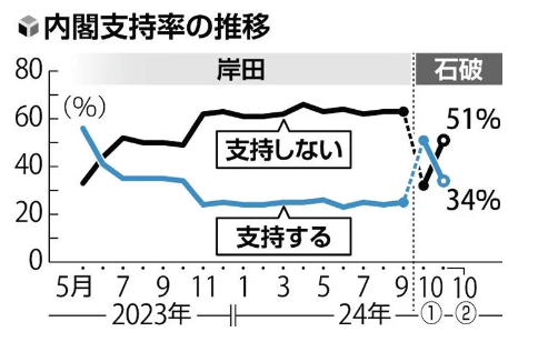 10月29日,《讀賣新聞》公佈的石破茂內閣最新支持率,從剛當選時的50.7%跌至34%;同一天,日本共同社公佈的一份最新電話民調則顯示,石破茂內閣支持率為32.1%。