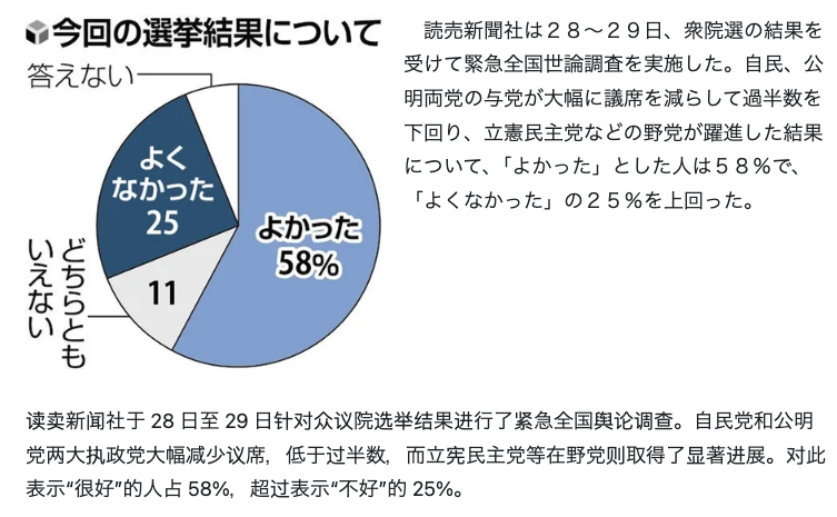 這個結果可以視作日本民眾對自民黨的一次極大懲罰。在《讀賣新聞》10月29日公佈的一份輿論調查中顯示,有58%的受訪對象對此次眾議院選舉結果感到滿意。