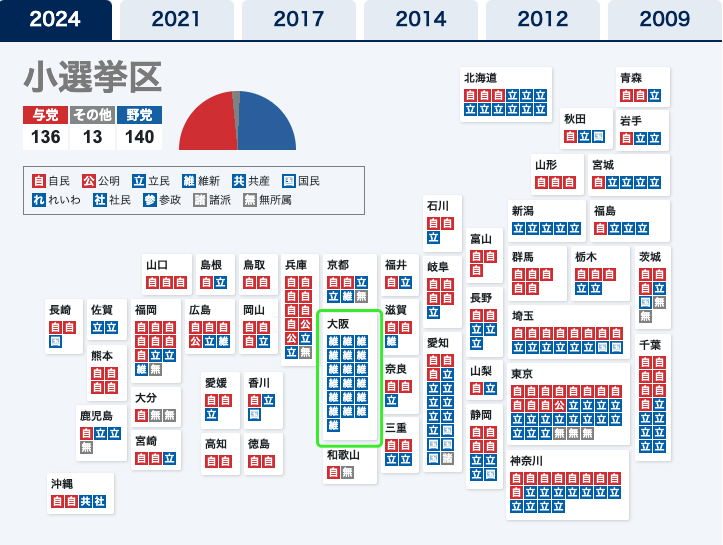 眾議院選舉結果的議員席次分佈情況讀賣新聞