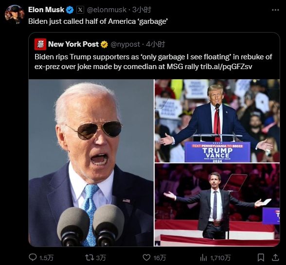作為特朗普鐵桿支持者,馬斯克在社交媒體X平台轉發相關報道:“拜登剛剛罵一半的美國人是垃圾。”