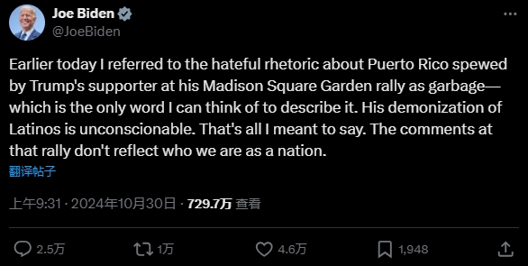 拜登本人也發佈推文極力爭辯:“今天早些時候,我將特朗普支持者在一場集會上對波多黎各發表的仇恨言論稱為垃圾。這是我能想到的唯一一個形容詞。他對拉丁裔的妖魔化是無恥的。這才是我的本意。”