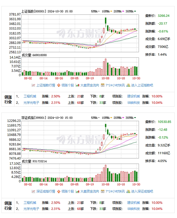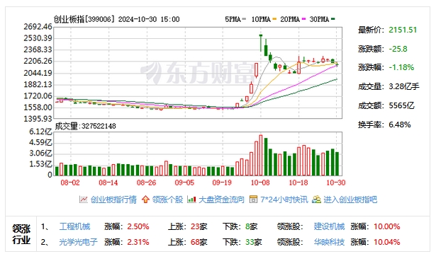 10月30日,A股三大指數今日集體回調,創業板指領跌。截止收盤,滬指跌0.61%,收報3266.24點;深證成指跌0.12%,收報10530.85點;創業板指跌1.18%,收報2151.51點。當天,兩市成交額18467億元,大盤資金淨流出超700億元。市場股票呈現跌多漲少的態勢,2320只股票上漲,2916只股票下跌。