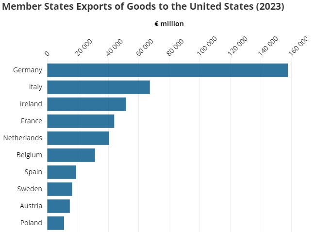 歐洲新聞網(Euronews)30日分析指出,特朗普提議對歐盟進口商品徵收10%的關税,這可能會損害歐洲的出口驅動型產業,如汽車與機械(2076億歐元)、化學品(1374億歐元)和其他製成品(1037億歐元)等;德國(1577億歐元)、意大利(673億歐元)以及愛爾蘭(516億歐元)等成員國將會是受影響最嚴重的歐盟國家。同時,歐盟的潛在報復措施可能加劇緊張局勢升級,進一步破壞美歐貿易關係。