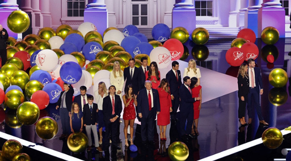 特朗普家族出現在2024年美國共和黨全國代表大會上,伊萬卡和庫什納站位靠後。 路透社