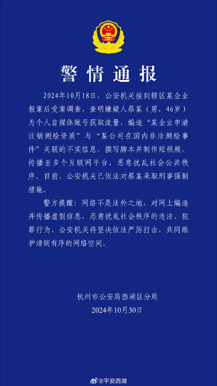 據微博@平安西湖 消息,杭州市公安局西湖區分局30日發佈警情通報稱,公安機關接到轄區某企業報案後受案調查,查明嫌疑人蔡某(男,46歲)為個人自媒體賬號獲取流量,編造“某企業申請註銷測繪資質”與“某公司在國內非法測繪事件”關聯的不實信息。目前,蔡某已被採取刑事強制措施。