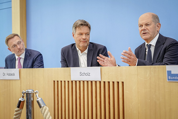 當地時間7月5日,德國財政部長林德納、經濟部長哈貝克、總理朔爾茨舉行新聞發佈會 視覺中國