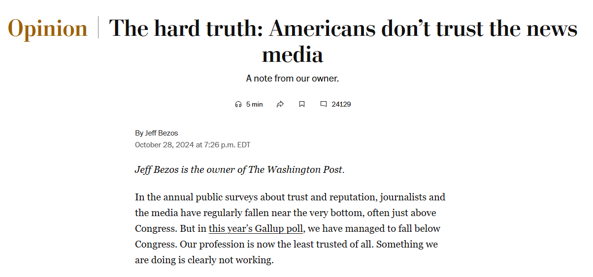 貝佐斯10月28日在《華盛頓郵報》投稿,以“殘酷的真相:美國人不再信任新聞媒體”為題解釋自己的決定。 截圖