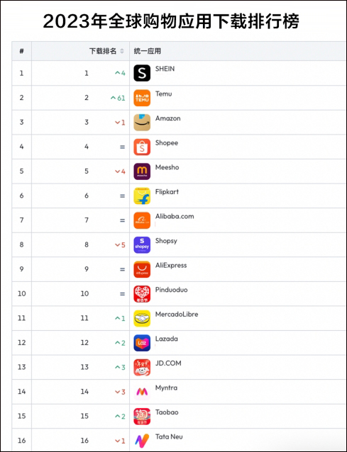 報告顯示,Temu、Amazon、Aliexpress分別位於2023購物類APP下載量第二位、第三位和第九位