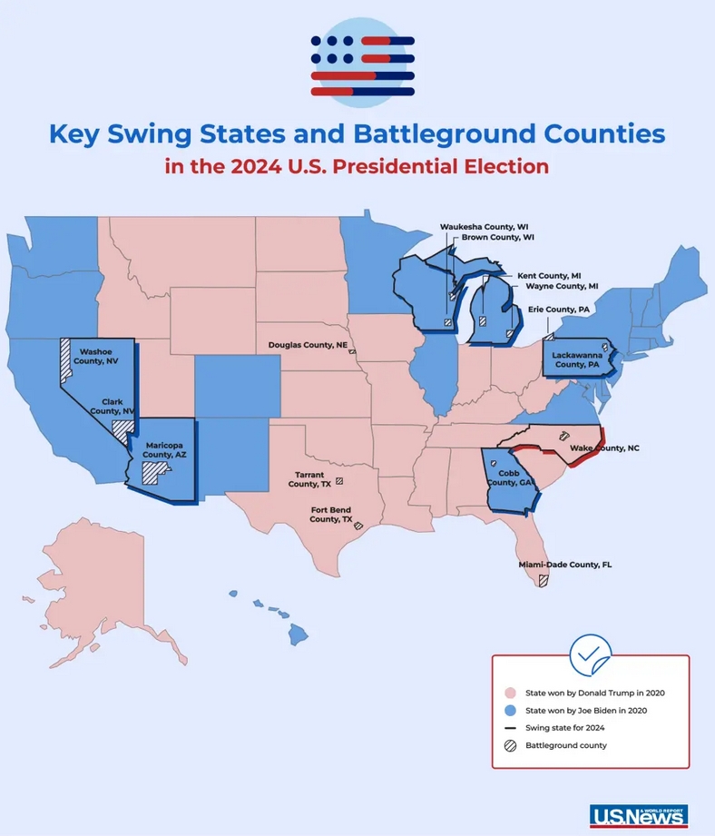 美國主要的搖擺州(黑線)和戰場縣(斜線)。 圖自:美國新聞與世界報道