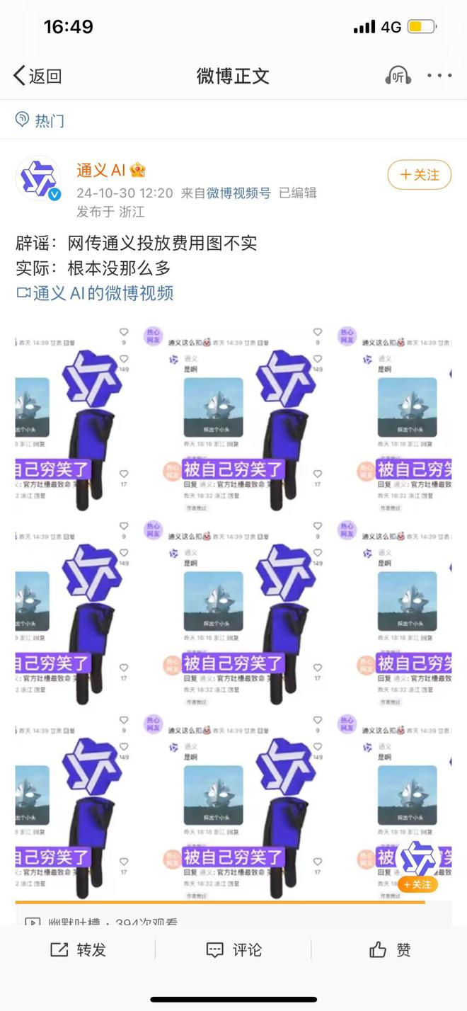 對此,通義AI通過官方微博對近期網傳的AI產品營銷投放數據進行了公開澄清,官方明確表示,實際投放費用遠低於網傳數字,但未具體透露真實投放金額。