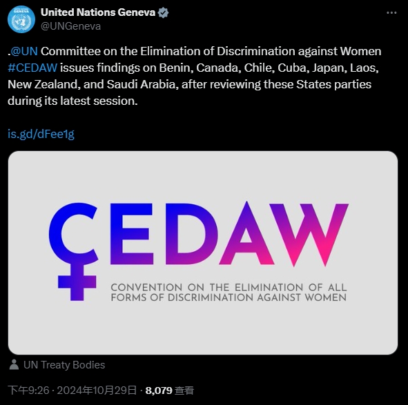 29日,聯合國消除對婦女歧視委員會公佈最終調查報告 推文截圖