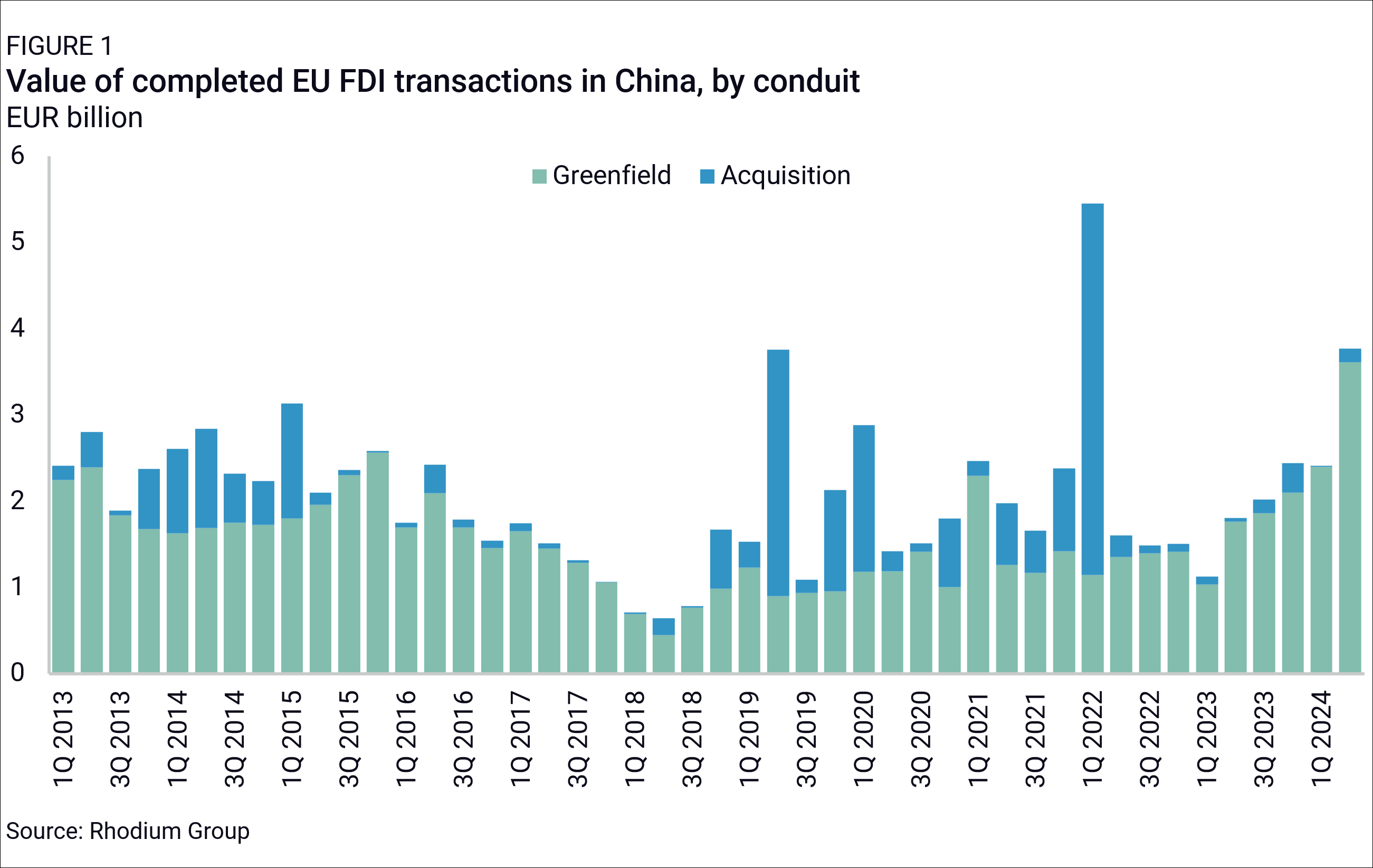 2013年第一季度至2024年第二季度,已完成的歐盟對華FDI項目價值(藍色為投資併購、綠色為綠地投資) 榮鼎集團