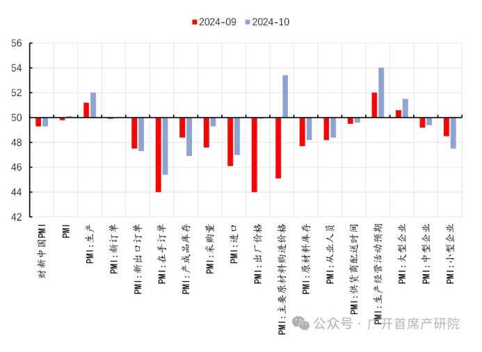 10月製造業積極性特點較多。一是供需繼續同步改善。一攬子增量政策推動生產動能繼續加快和需求持續回暖。除了新訂單指數重新擴張之外,進口指數也回升0.9個百分點至47,創近三個月新高。二是價格指數顯著回升。原材料購進價格和出廠價格分別大幅上漲8.3和5.9個百分點。前者(53.4)不僅時隔4個月重新擴張,且創近5個月新高;後者(49.9)則離擴張區間僅一步之遙。價格指數的大幅好轉對於內需的持續回暖有較強帶動作用。三是企業對經營預期信心顯著增強。事實上,一攬子政策的出台對於改善市場預期和提升市場信心有着最為直接的推動作用。10月預期指數擴張加快2個百分點,且為近5個月高位就是最好的體現。不過出口指數微降0.2個百分點和小企業PMI下降1個百分點等不佳指數仍需引起足夠重視。前者表明外需出口較大波動,或對10月出口形成制約;後者則表明,仍需把提振小企業經營狀況作為四季度的政策發力點。在非製造業中,儘管建築業增速放緩,但服務業僅隔一個月再度擴張,預期指數也取得較大漲幅。