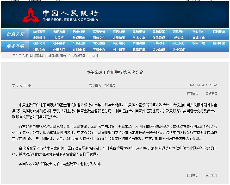 據人民銀行網站10月31日消息,中美金融工作組於國際貨幣基金組織和世界銀行2024年10月年會期間,在美國華盛頓召開第六次會議。會議由中國人民銀行副行長宣昌能和美國財政部助理部長奈曼共同主持。國家金融監督管理總局、中國證監會、國家外匯管理局,以及美聯儲、美國證券交易委員會、聯邦存款保險公司等部門參會。