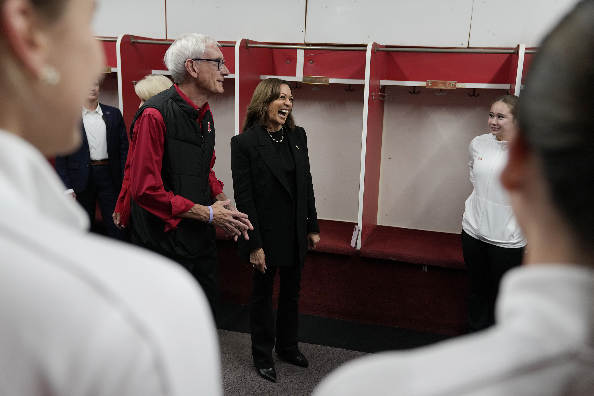 2024年10月30日哈里斯在競選集會上與威斯康星大學女子排球隊進行交流 視覺中國