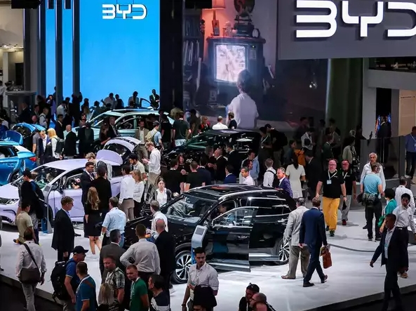 2023年9月6日,在德國慕尼黑舉行的IAA Mobility 2023國際汽車展上,參會者參觀中國汽車品牌比亞迪的電動汽車。 法新社