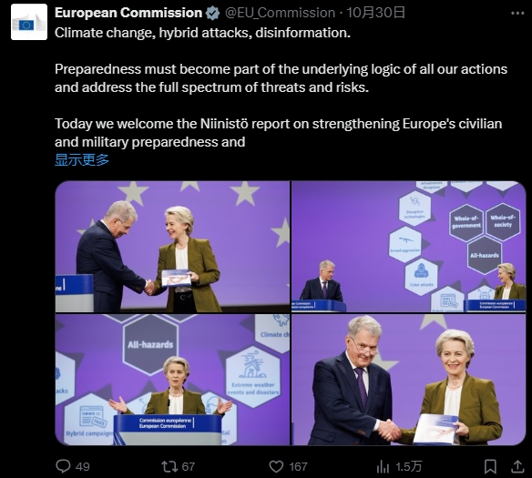 據介紹,今年3月份,馮德萊恩授予尼尼斯托一項任務,要求他提交一份關於歐盟戰備和民防狀況的詳細報告,並提出改進建議。這份報告將為馮德萊恩的第二任期提供參考,屆時歐盟將迎來首位國防事務專員,其任務在於負責起草並在春季前發佈一份國防白皮書。