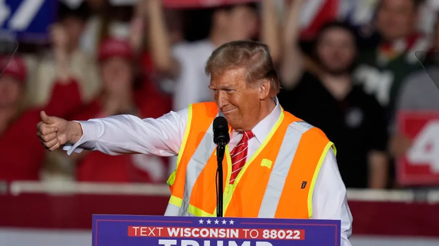 **13. 我們都是“垃圾”。垃圾車和環衞工人背心。**10月30日,特朗普來到威斯康星拉州。這個老戲精直接穿着環衞工人背心,開着垃圾車出來了。