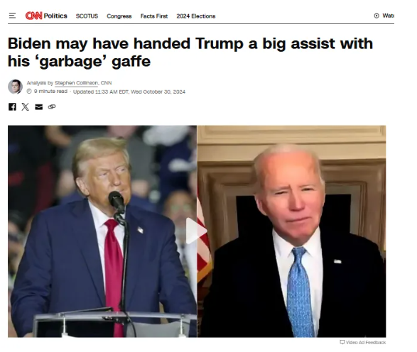 拜登的意思是説,他描述為“垃圾”的,是那一位具體特朗普支持者針對波多黎各的具體言論,但不是用來描述特朗普的支持者們的。但實際上,他在視頻裏確實説特朗普及其支持者為“垃圾”。特朗普會把這段視頻變成無數的競選廣告,在接下來的幾天裏反覆播放。損害已然造成。由於拜登的失誤,本來民主黨突然有了一點輿論優勢,現在拱手讓回給特朗普。