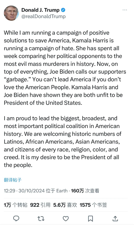 “當我在進行一個通過積極解決方案拯救美國的選舉時,卡瑪拉·哈里斯卻在推行一場基於仇恨的競選。整整一週,她都在把她的政治對手與史上最邪惡的大屠殺者相提並論。現在,喬·拜登甚至稱我們的支持者為‘垃圾’。如果你不愛美國人民,你就無法領導美國。卡瑪拉·哈里斯和喬·拜登都已經表明:他們都不適合成為美國總統。我為能領導美國曆史上最大、最廣泛、最重要的政治聯盟感到自豪。我們歡迎歷史上最多的拉丁裔、非裔美國人、亞裔美國人,以及來自各種種族、宗教、膚色和信仰的公民。我希望成為全體人民的總統”。