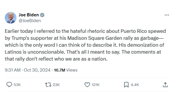 “今天早些時候,我把特朗普支持者在他馬迪遜廣場花園集會上對波多黎各的仇恨言論稱為‘垃圾’——這是我當時能想到的唯一形容詞。他對拉丁裔的妖魔化是不可饒恕的。這就是我想説的全部。那場集會上所説的評論並不代表我們國家的精神”。