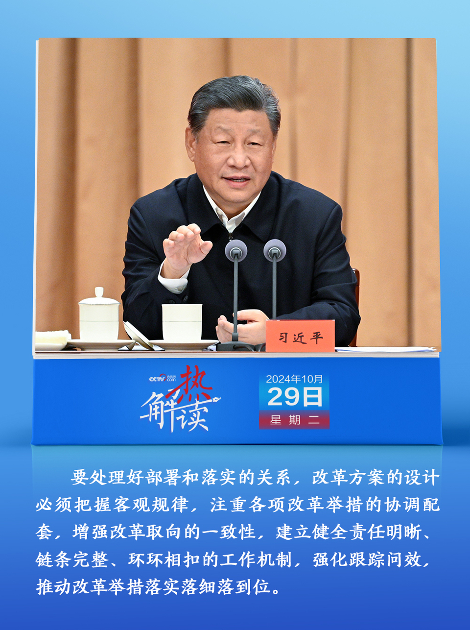10月29日,省部級主要領導幹部學習貫徹黨的二十屆三中全會精神專題研討班開班。在開班式上,習近平總書記明確提出要“處理好部署和落實的關係”,“建立健全責任明晰、鏈條完整、環環相扣的工作機制,強化跟蹤問效,推動改革舉措落實落細落到位”。