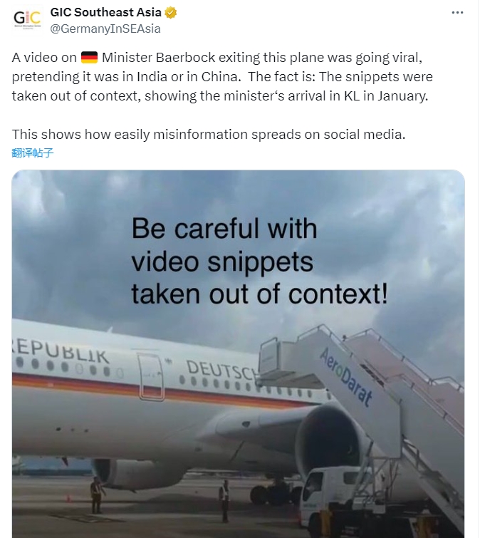在本週的德國內閣簡報會上,德國外交部發言人菲舍爾對上述視頻做出了同樣的解釋,強調視頻中的所在地既不是中國也不是印度。德外交部下屬的公共外交項目“德國東南亞信息中心”,也在其官方賬號上做出澄清聲明,稱網傳視頻被斷章取義,貝爾伯克在走了幾步後便受到了馬來西亞禮賓司和德國駐馬來西亞大使的熱烈歡迎,斥責社交媒體廣泛傳播了錯誤信息。