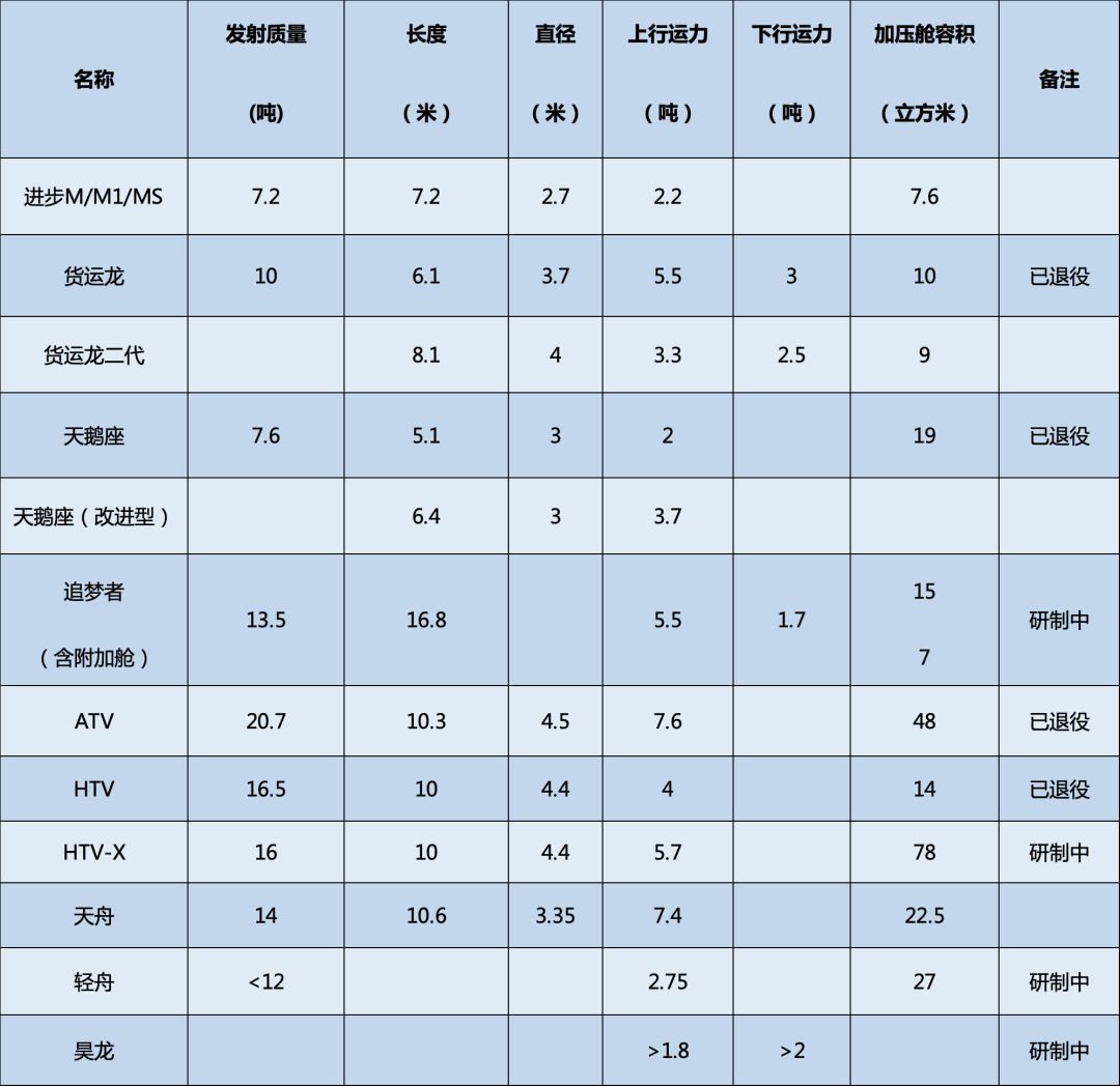 兩款低成本貨運運輸工具都滿足了方案召集時提出的性能指標。據稱來自中科院的信息顯示,輕舟飛船上行運輸能力2.75噸,下行(銷燬)能力2.9噸,均超要求的1.8噸和2噸指標。昊龍運力未透露,但官媒採用“較大的貨物上下行能力”説法,説明它的運載能力也不低。下表是全球範圍內所有貨運飛船的比較。