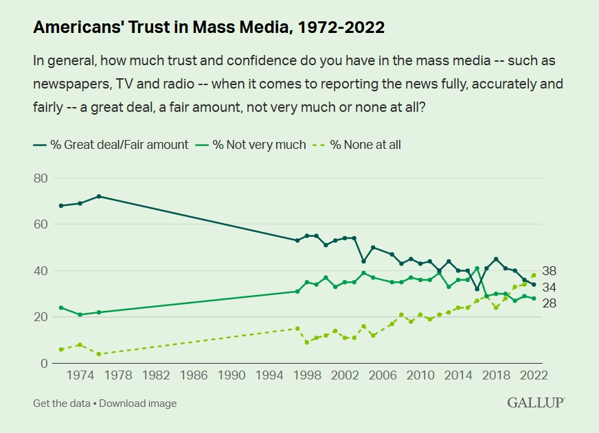 自此,“第四權力”進入衰敗,不斷淪為黨政的“喉舌”。森雄説:“不訂閲《洛杉磯時報》只會進一步導致民主和第四權力的消亡”,可後真相時代被政黨綁架的媒體讓事情變成了“訂閲媒體就是支持政黨話語,第四權一開始就不存在”。根據2022年蓋洛普的調查數據顯示,美國人對媒體的信任度已接近歷史最低水平。