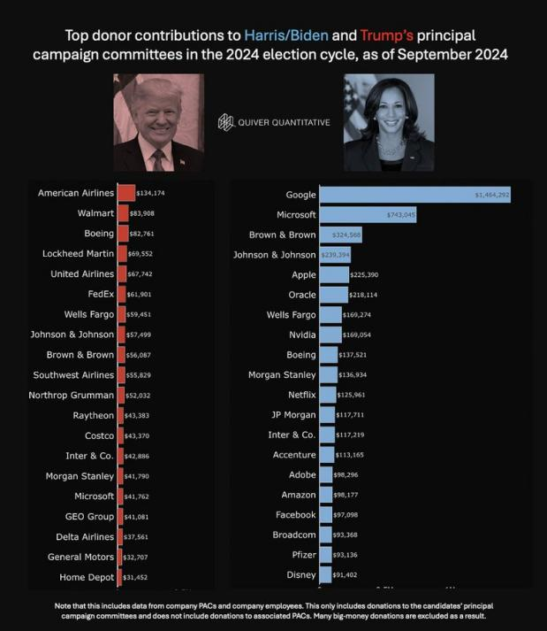 其實不止媒體界,軍工複合體和硅谷科技集團也是如此4。根據相關公司統計,本次大選背後的金主在軍工界和科技界都有了新的分化。