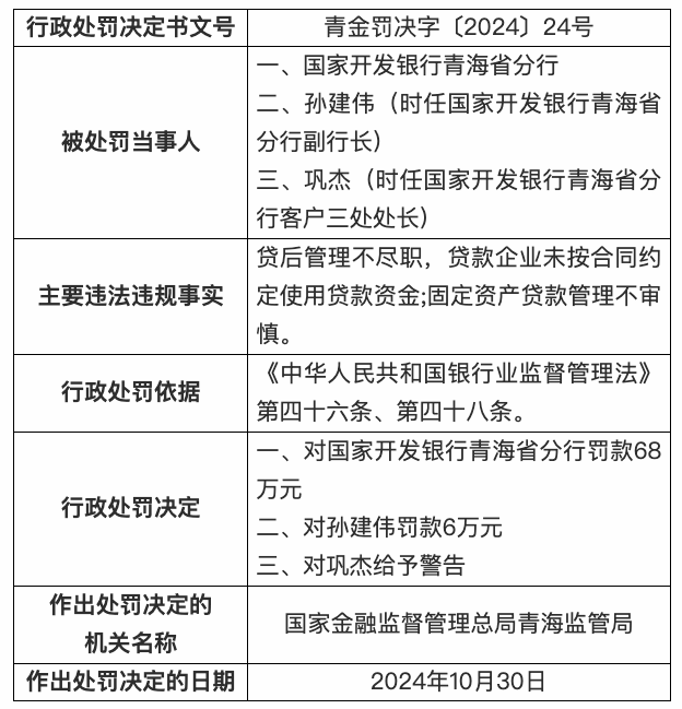 時任國家開發銀行青海省分行副行長孫建偉被處罰款6萬元;時任國家開發銀行青海省分行客户三處處長鞏傑受到警告處罰。