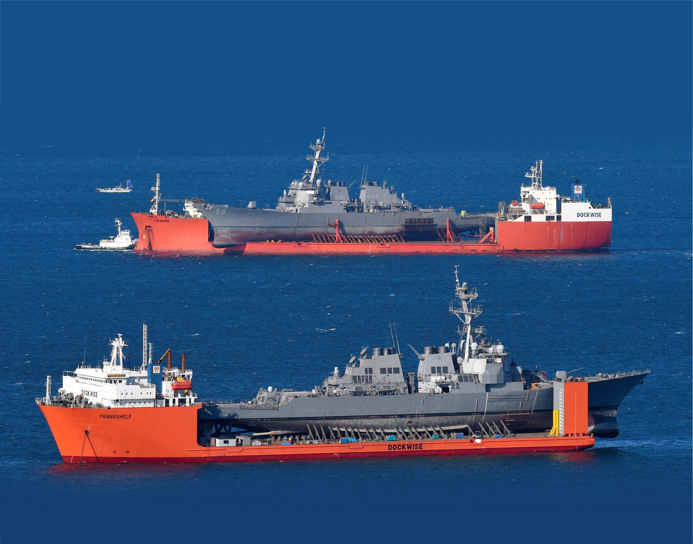 名場面:DDG-56“麥凱恩”(上)與DDG-62“菲茨傑拉德”(下)的“特別合影”,如今看來,同樣遭遇撞船事故的“菲茨傑拉德”,艦體損傷程度可能遠高於“麥凱恩”