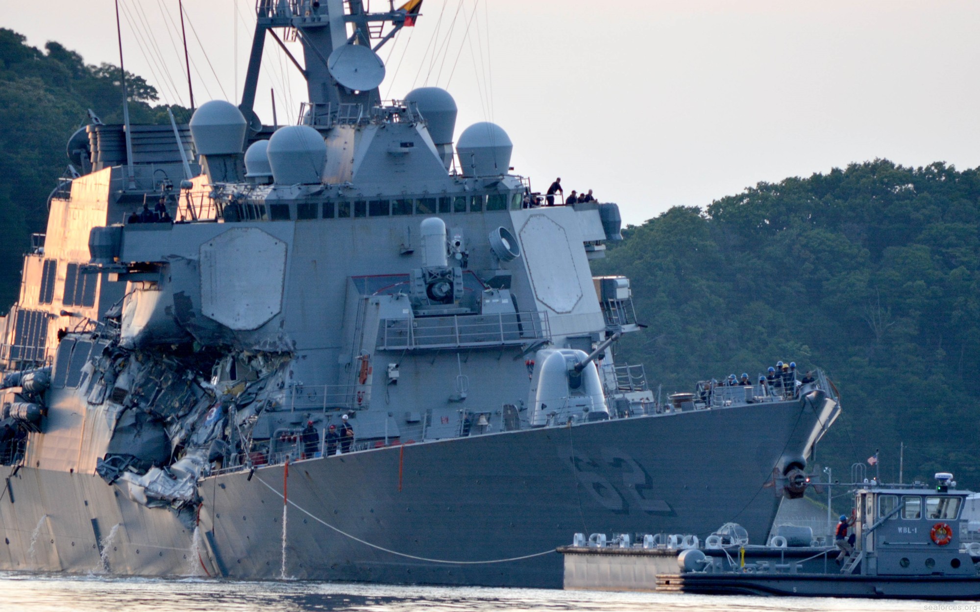 (資料圖)2017年6月17日凌晨,DDG-62“菲茨傑拉德”號在橫須賀附近與一艘集裝箱貨輪發生碰撞,右舷上層建築嚴重受損