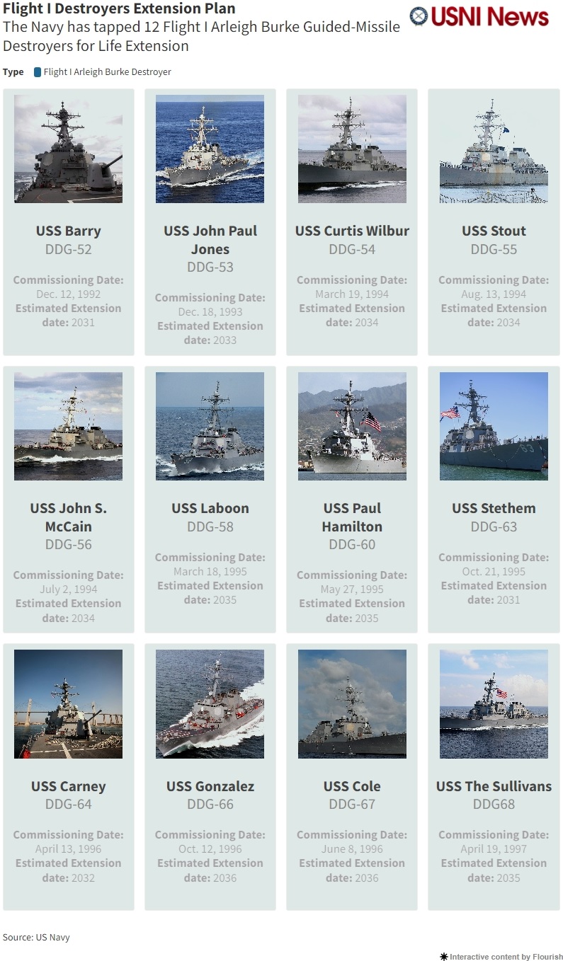 該決定基於當前對相關艦艇的逐一評估,包括艦體結構狀況、作戰能力、技術可行性和全壽命維護需求等。在過去10個月期間,美國海軍應國防部長勞埃德·奧斯汀的要求,對全部FlightⅠ批次“阿利·伯克”級驅逐艦(DDG-51~DDG-71,共21艘)進行“全面評估”,最終確定了12艘驅逐艦可以在到達預計壽命後繼續服役。USNI新聞網、《星條旗報》(Stars and Strips)等媒體在報道中列出了這12艘驅逐艦,它們將各自延長服役1至5年不等: