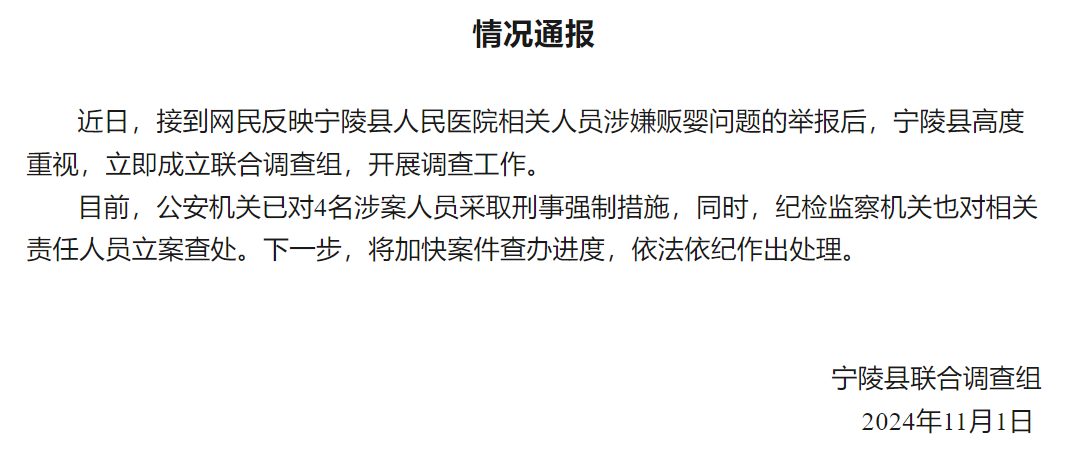 近日,接到網民反映寧陵縣人民醫院相關人員涉嫌販嬰問題的舉報後,寧陵縣高度重視,立即成立聯合調查組,開展調查工作。