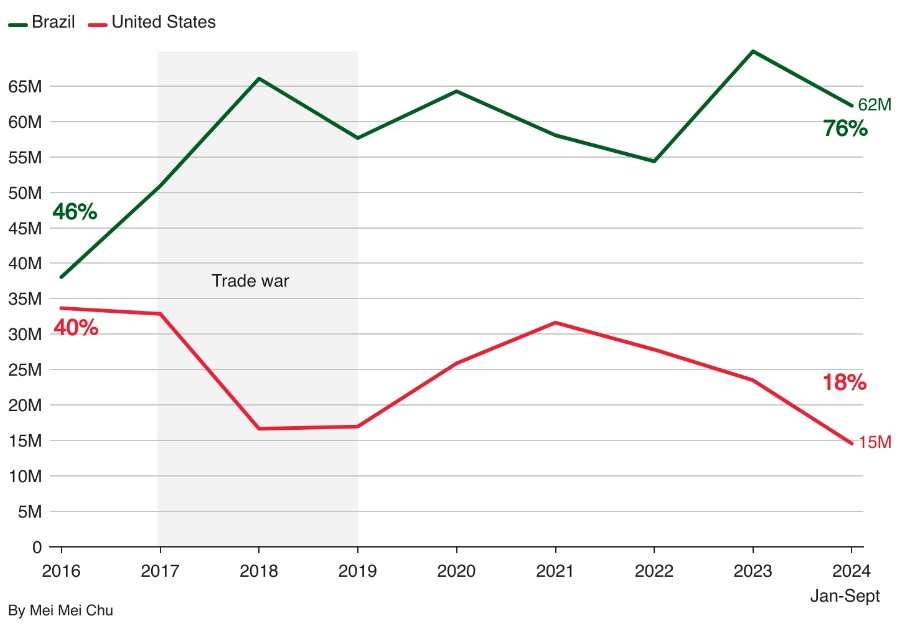 自2018年以來,中國一直在實現供應源多元化,以減少對美國農產品的依賴。紅色代表美國,綠色代表巴西。路透社製圖