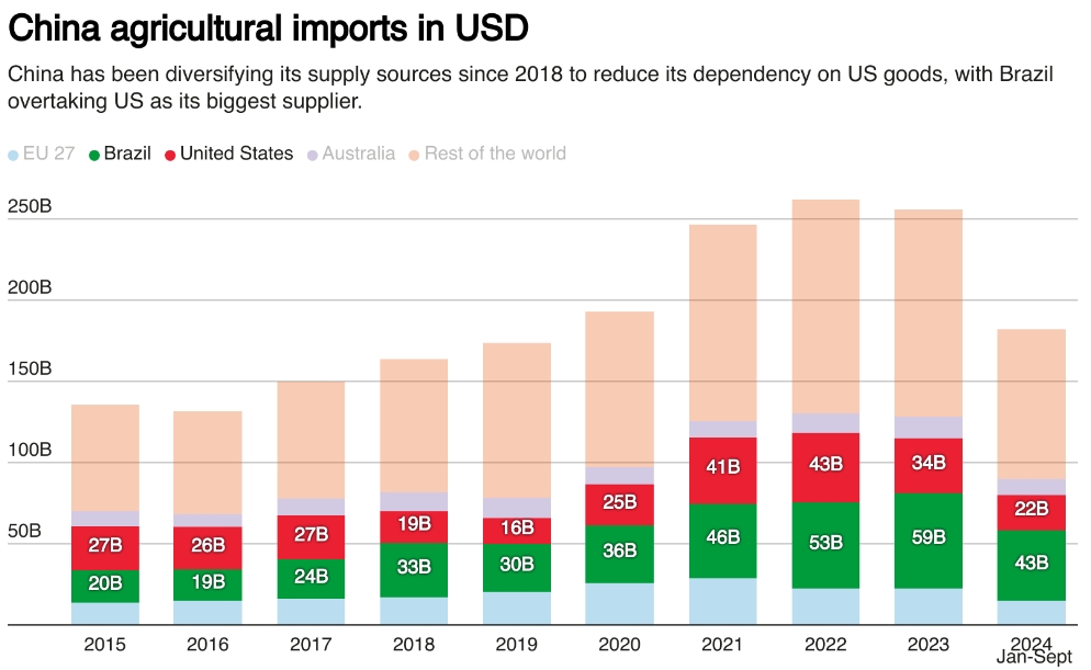 報道引述中國海關數據稱,今年中國從美國進口的大豆份額已經從2016年的40%降至18%,而巴西進口所佔的份額從46%增至76%;玉米進口情況亦然,在中國批准從巴西採購玉米僅一年後,巴西已於2023年取代美國,成為中國最大的玉米供應國。與此同時,中國一邊有序擴大轉基因大豆玉米的應用範圍,一邊逐漸減量替代飼用豆粕的使用,以實現糧食自給自足。