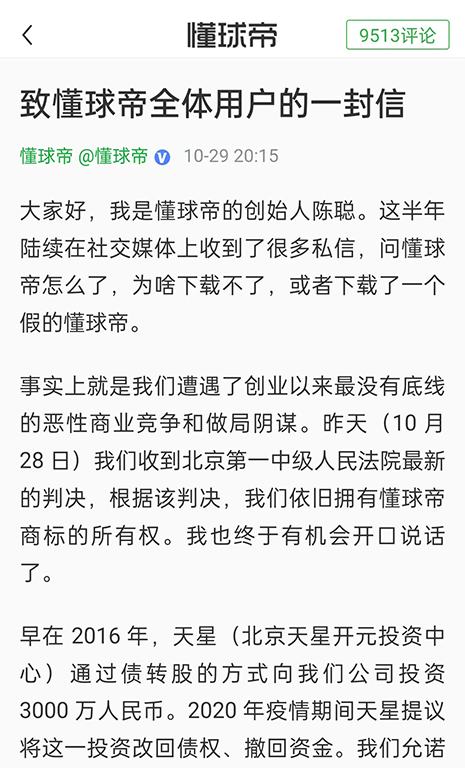 10月29日,懂球帝App的首頁上出現了一則置頂頭條,題為“致懂球帝全體用户的一封信”,是懂球帝的創始人陳聰對於前段時間用户“用不了,下載不了,下載到山寨懂球帝”等問題的回應。