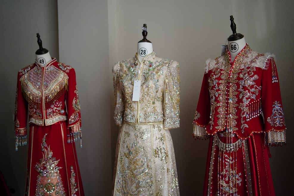 ▲通過改良面料提升做工,查蘭如在拼多多經營中高端敬酒服。(郭家寶 攝)