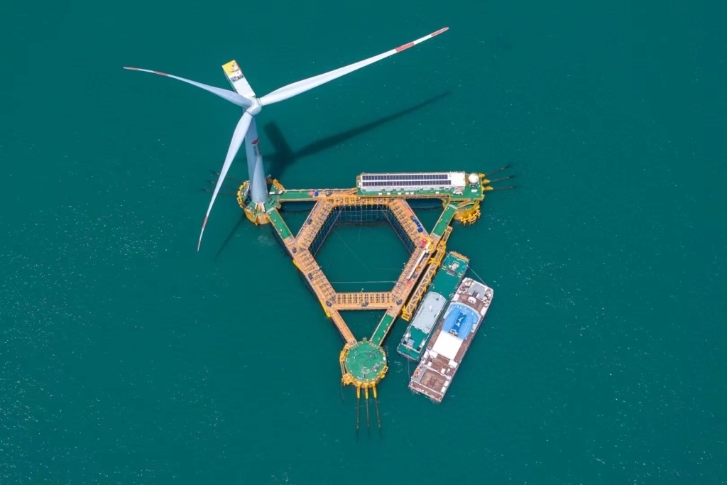 試想一下這樣的場景:水下養魚、水上發電,既生產清潔電力,又孕育“藍色糧倉”。來到莆田市南日島,一座巨型“風車”——全球首座風漁融合浮式海上平台“國能共享號”,隨着海風轉動。