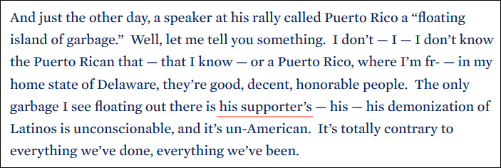 10月29日,拜登與西班牙裔民權組織舉行電話會議時提及此事,他嚴厲指責特朗普妖魔化美國的拉丁裔,但同時攻擊了特朗普的支持者。拜登稱:“我看到的唯一垃圾就是他(特朗普)的支持者,他對拉丁裔的妖魔化是不可理喻的,不符合美國精神。”