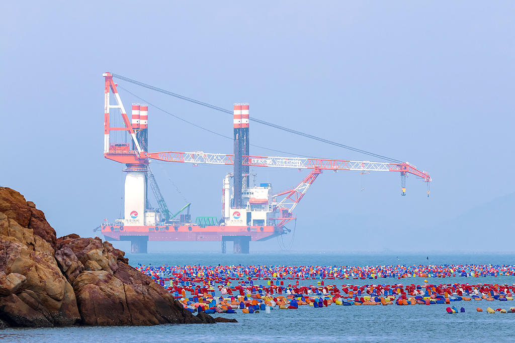 2024年2月18日,廣東汕頭,南澳海上風電場、海上漁村“彩虹海”海域風電安裝平台“海龍風電”號 視覺中國