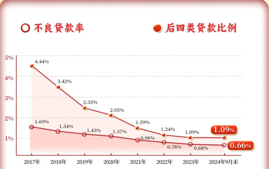 在資產質量方面,截至2024年9月末,成都銀行不良貸款率0.66%,較上年末下降0.02個百分點,後四類貸款比例已經下降至1.09%。通過趨勢變化看特點。該行不良貸款率已經是連續八年實現下降,近兩年不良貸款率穩定在0.7%以下的低位區間,總體趨於審慎和穩健。