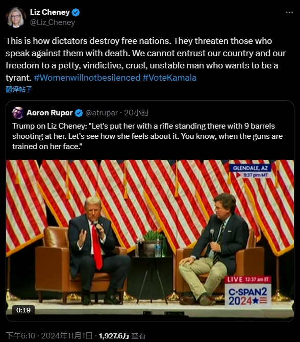 隨後,切尼迅速作出回應,稱特朗普為“獨裁者”。她在社交媒體X平台轉發相關視頻並寫道:“這就是獨裁者摧毀自由國家的方式。他們對那些反對他們的人發出死亡威脅。我們不能把我們的國家和自由託付給一個心胸狹窄、心懷惡意、殘忍、不穩定、想要當暴君的人。”