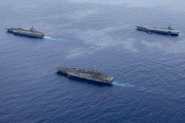 2024年8月在北大西洋,“艾森豪威爾”號(左)、“杜魯門”號(下)、“福特”號(上)組成三航母編隊
