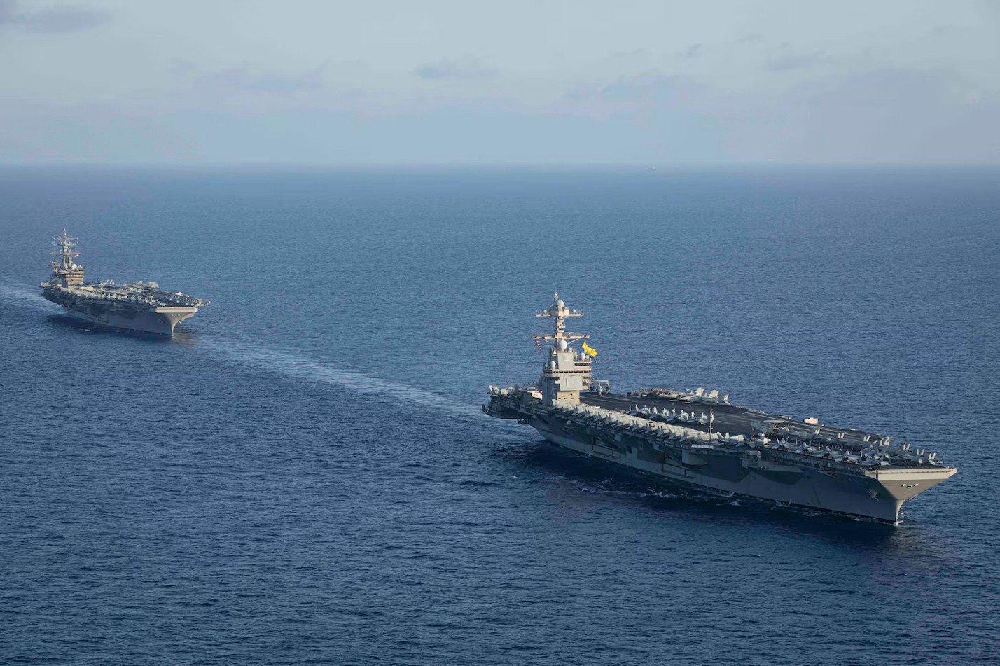 2023年11月“福特”號(前)、“艾森豪威爾”號(後)在東地中海的雙航母編隊