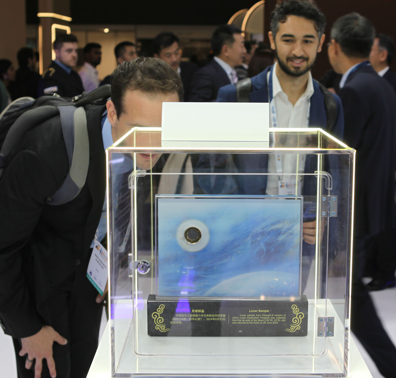 第75屆國際宇航大會召開,國際宇航大會與會人士參觀展出的嫦娥六號月球背面樣品。 視覺中國