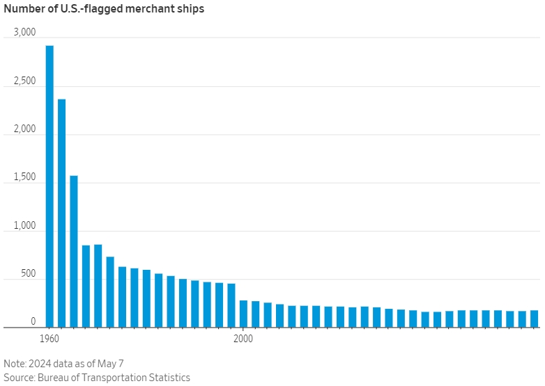 截至今年5月,懸掛美國國旗的商船數量,數據來自美國運輸統計局。《華爾街日報》製圖