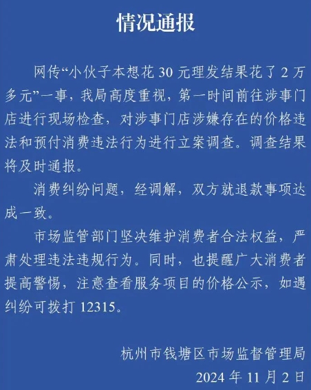 據微信公眾號“錢塘市場監管”消息,杭州市錢塘區市場監督管理局11月2日發佈情況通報稱,網傳“小夥子本想花30元理髮結果花了2萬多元”一事,該局高度重視,第一時間前往涉事門店進行現場檢查,對涉事門店涉嫌存在的價格違法和預付消費違法行為進行立案調查。調查結果將及時通報。